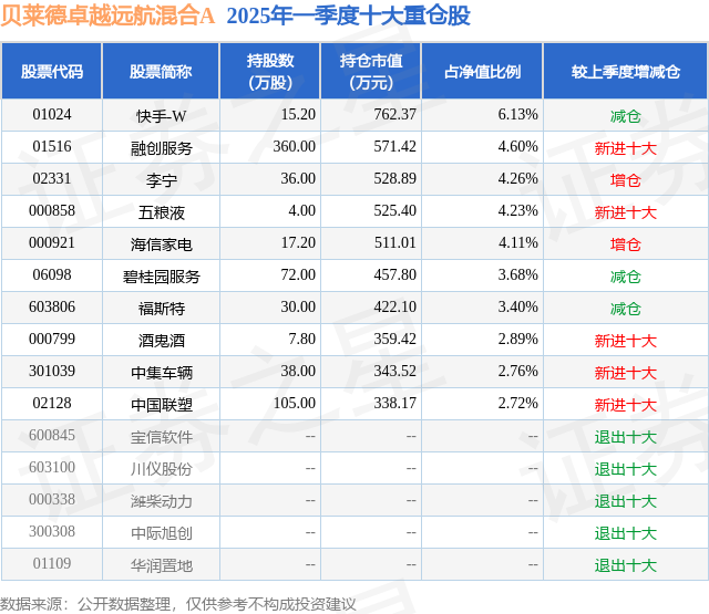 贝莱德卓越远航混合A的前十大重仓股如下:
