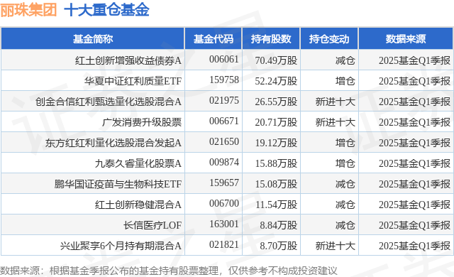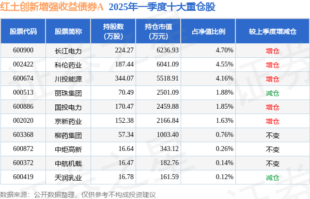根据2025基金Q1季报公募基金重仓股数据,重仓该股的公募基金共21家,其中持有数量最多的公募基金为红土创新基金的红土创新增强收益债券A。红土创新增强收益债券A目前规模为12.69亿元,最新净值1.3621(7月15日),较上一交易日上涨0.05%,近一年上涨2.72%。该公募基金现任基金经理为陈若劲 杨一。陈若劲在任的基金产品包括:红土创新稳健混合A,管理时间为2019年3月13日至今,期间收益率为58.83%;红土创新稳进混合A,管理时间为2020年3月6日至今,期间收益率为35.62%;红土创新添利债券A,管理时间为2022年9月21日至今,期间收益率为9.54%。杨一在任的基金产品包括:红土创新稳健混合A,管理时间为2019年8月21日至今,期间收益率为53.5%;红土创新添利债券A,管理时间为2022年9月21日至今,期间收益率为9.54%。