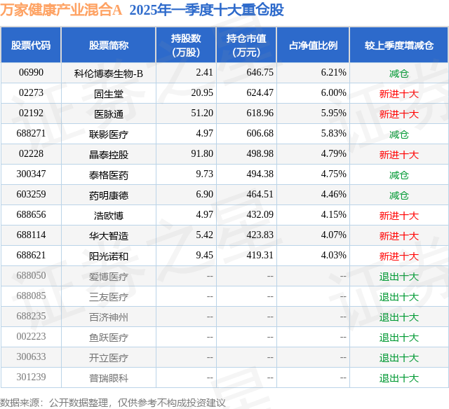 根据2025基金Q1季报公募基金重仓股数据,重仓该股的公募基金共2家,其中持有数量最多的公募基金为万家基金的万家健康产业混合A。万家健康产业混合A目前规模为0.84亿元,最新净值0.742(7月15日),较上一交易日上涨2.59%,近一年上涨2.01%。该公募基金现任基金经理为王霄音。王霄音在任的基金产品包括:万家研究领航混合A,管理时间为2024年5月23日至今,期间收益率为-14.92%。