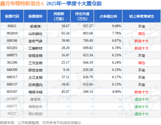 鑫元专精特新混合A的前十大重仓股如下: