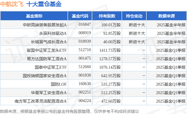 重仓中航沈飞的前十大公募基金请见下表: