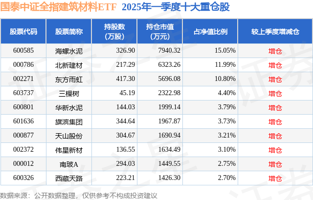国泰中证全指建筑材料ETF的前十大重仓股如下: