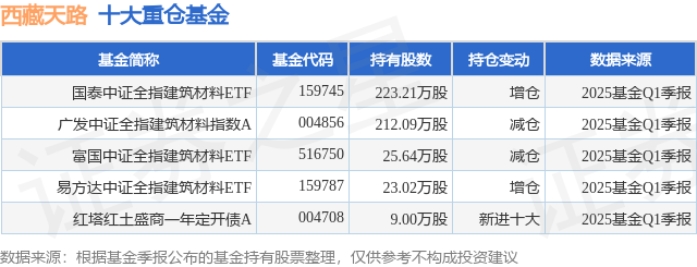 根据2025基金Q1季报公募基金重仓股数据,重仓该股的公募基金共5家,其中持有数量最多的公募基金为国泰基金的国泰中证全指建筑材料ETF。国泰中证全指建筑材料ETF目前规模为5.27亿元,最新净值0.5895(7月16日),较上一交易日下跌0.29%,近一年上涨11.65%。该公募基金现任基金经理为黄岳。黄岳在任的基金产品包括:国泰中证医疗ETF,管理时间为2021年2月5日至今,期间收益率为-60.22%;国泰中证生物医药ETF,管理时间为2021年2月5日至今,期间收益率为-48.36%;国泰中证科创创业50ETF,管理时间为2021年6月29日至今,期间收益率为-37.36%。