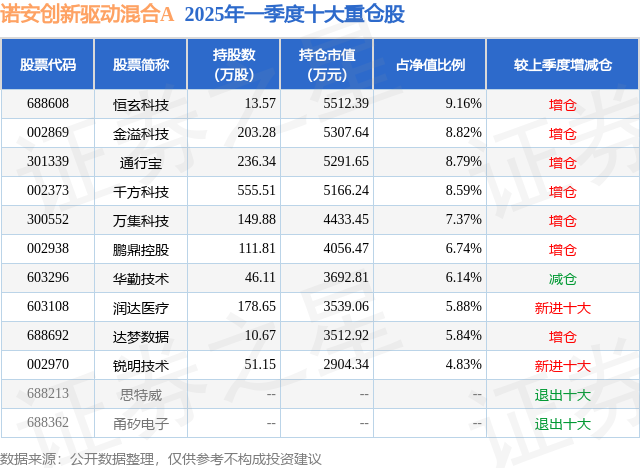 诺安创新驱动混合A的前十大重仓股如下: