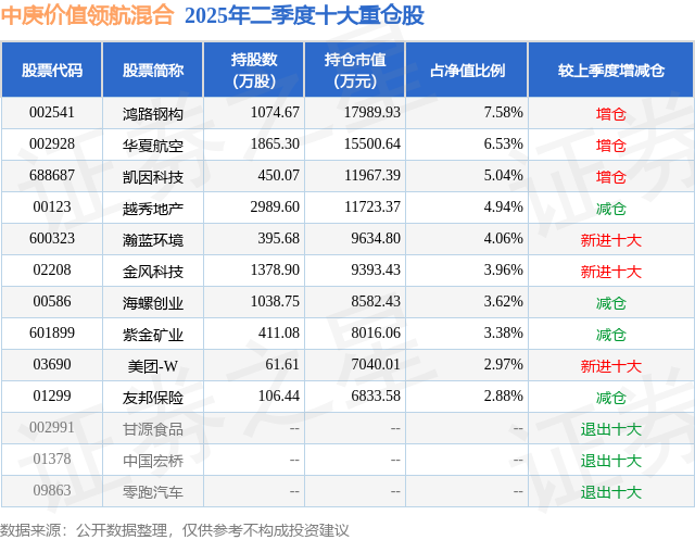 中庚价值领航混合的前十大重仓股如下: