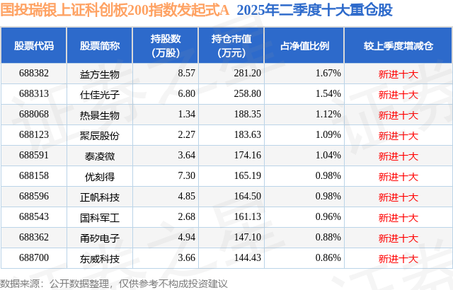 根据2025基金半年报公募基金重仓股数据,重仓该股的公募基金共2家,其中持有数量最多的公募基金为国投瑞银基金的国投瑞银上证科创板200指数发起式A。国投瑞银上证科创板200指数发起式A目前规模为0.94亿元,最新净值1.0898(7月17日),较上一交易日上涨2.41%。该公募基金现任基金经理为赵建 钱瀚。赵建在任的基金产品包括:国投沪深300金融地产联接,管理时间为2015年2月10日至今,期间收益率为85.65%;国投瑞银深证100指数,管理时间为2015年8月14日至今,期间收益率为25.28%;国投瑞银金融地产ETF,管理时间为2019年10月29日至今,期间收益率为43.36%;国投瑞银专精特新量化选股混合A,管理时间为2023年7月15日至今,期间收益率为18.05%。钱瀚在任的基金产品包括:国投瑞银金融地产ETF,管理时间为2023年8月15日至今,期间收益率为34.44%;国投瑞银中证机器人指数发起式A,管理时间为2024年11月19日至今,期间收益率为9.13%;国投瑞银中证港股通央企红利指数发起式A,管理时间为2024年11月19日至今,期间收益率为17.91%;