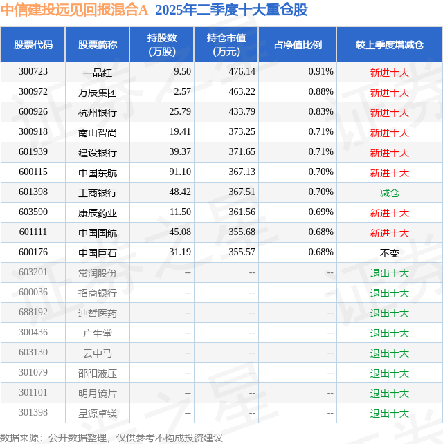 中信建投远见回报混合A的前十大重仓股如下: