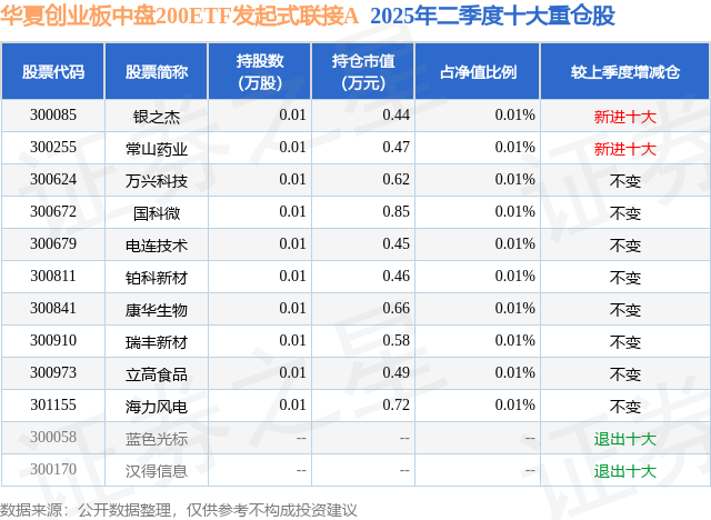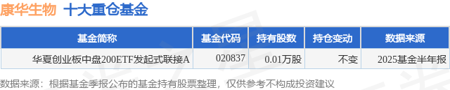 根据2025基金半年报公募基金重仓股数据,重仓该股的公募基金共1家,其中持有数量最多的公募基金为华夏基金的华夏创业板中盘200ETF发起式联接A。华夏创业板中盘200ETF发起式联接A目前规模为0.27亿元,最新净值1.3482(7月18日),较上一交易日下跌0.16%,近一年上涨56.79%。该公募基金现任基金经理为华龙。华龙在任的基金产品包括:华夏饲料豆粕期货ETF联接A,管理时间为2022年8月22日至今,期间收益率为16.66%;华夏上证50AH优选指数A,管理时间为2022年8月22日至今,期间收益率为16.83%;华夏中证机器人ETF发起式联接A,管理时间为2023年5月31日至今,期间收益率为6.84%;华夏消费电子ETF联接A,管理时间为2023年6月2日至今,期间收益率为25.44%。