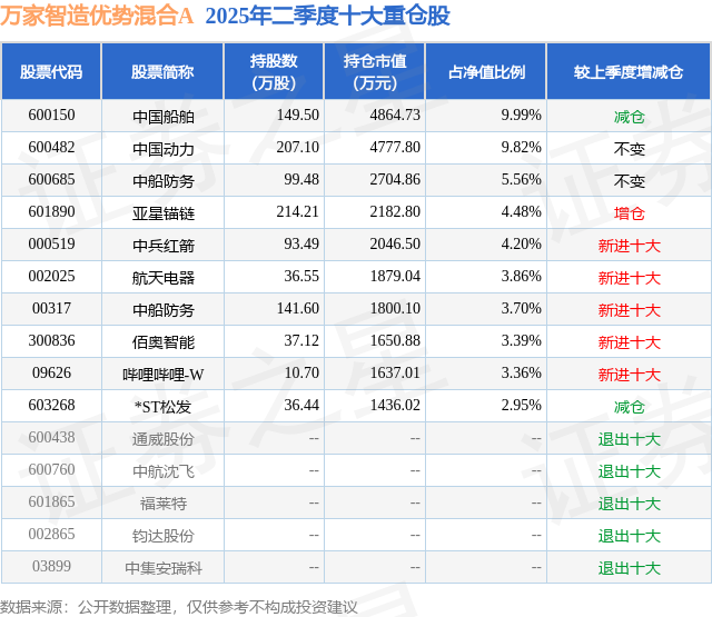 万家智造优势混合A的前十大重仓股如下:
