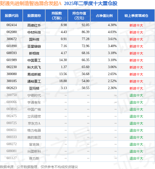 根据2025基金半年报公募基金重仓股数据,重仓该股的公募基金共3家,其中持有数量最多的公募基金为财通基金的财通先进制造智选混合发起A。财通先进制造智选混合发起A目前规模为0.19亿元,最新净值1.2015(7月18日),较上一交易日下跌0.16%,近一年上涨20.34%。该公募基金现任基金经理为朱海东 顾弘原。朱海东在任的基金产品包括:财通沪深300指数增强,管理时间为2019年7月16日至今,期间收益率为49.46%;财通智选消费股票A,管理时间为2021年1月27日至今,期间收益率为-31.49%;财通中证500指数增强A,管理时间为2023年7月13日至今,期间收益率为6.96%;财通中证1000指数增强A,管理时间为2023年11月7日至今,期间收益率为16.3%。顾弘原在任的基金产品包括:财通智选消费股票A,管理时间为2022年8月5日至今,期间收益率为-17.89%;财通中证ESG100指数增强A,管理时间为2023年1月16日至今,期间收益率为9.54%;财通多策略福瑞混合发起式(LOF)C,管理时间为2023年4月11日至今,期间收益率为2.1%;财通中证500指数增强A,管理时间为2023年7月13日至今,期间收益率为6.96%。