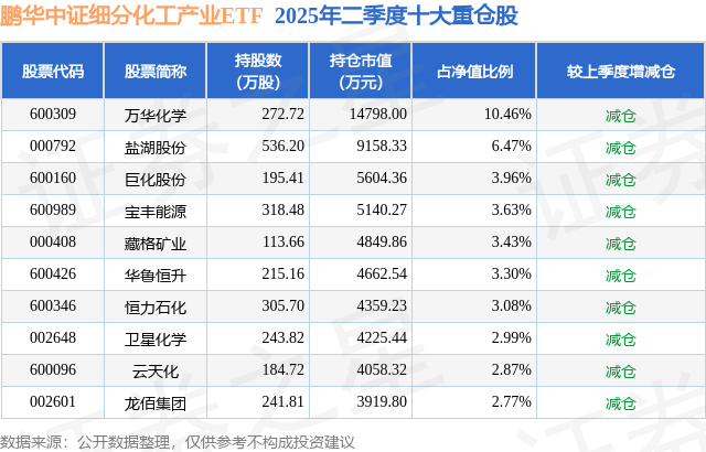鹏华中证细分化工产业ETF的前十大重仓股如下: