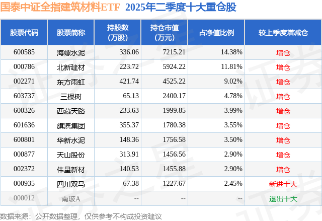 国泰中证全指建筑材料ETF的前十大重仓股如下: