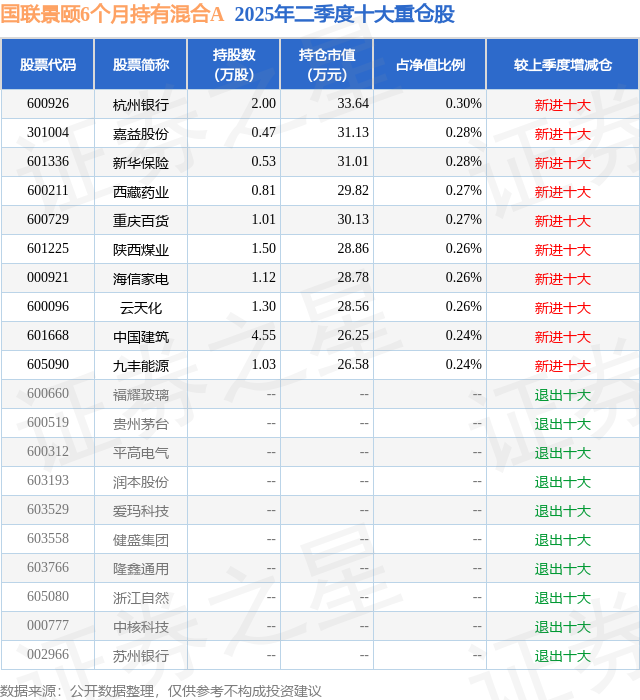 国联景颐6个月持有混合A的前十大重仓股如下: