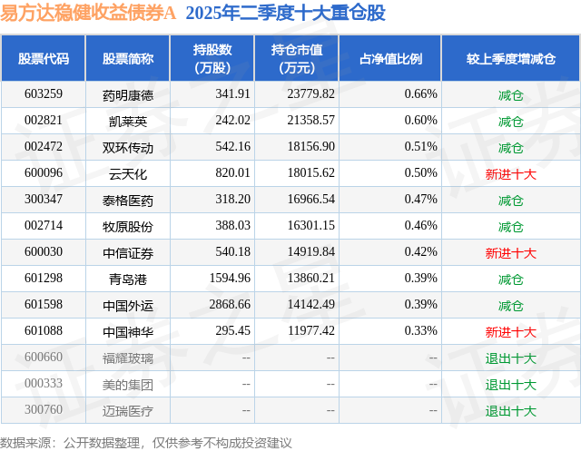 根据2025基金半年报公募基金重仓股数据,重仓该股的公募基金共29家,其中持有数量最多的公募基金为易方达基金的易方达稳健收益债券A。易方达稳健收益债券A目前规模为101.33亿元,最新净值1.4184(7月18日),较上一交易日上涨0.13%,近一年上涨8.73%。该公募基金现任基金经理为胡剑。胡剑在任的基金产品包括:易方达裕惠定开混合A,管理时间为2013年12月17日至今,期间收益率为182.85%;易方达岁丰添利债券(LOF)A,管理时间为2019年1月4日至今,期间收益率为55.44%;易方达恒盛3个月定开混合,管理时间为2019年9月6日至今,期间收益率为44.51%。