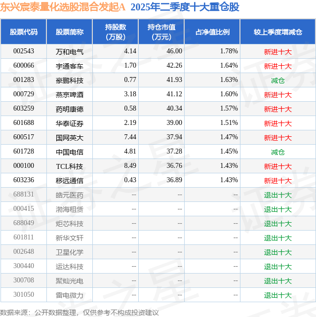 东兴宸泰量化选股混合发起A的前十大重仓股如下: