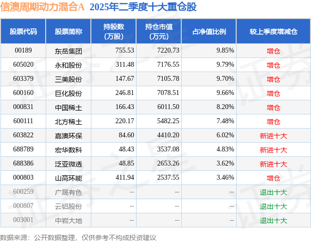 根据2025基金Q1季报公募基金重仓股数据,重仓该股的公募基金共8家,其中持有数量最多的公募基金为信达澳亚基金的信澳周期动力混合A。信澳周期动力混合A目前规模为6.79亿元,最新净值1.525(7月21日),较上一交易日上涨1.13%,近一年上涨31.17%。该公募基金现任基金经理为吴清宇 张明烨。吴清宇在任的基金产品包括:信澳景气优选混合A,管理时间为2021年12月21日至今,期间收益率为12.13%;信澳优势产业混合A,管理时间为2023年5月29日至今,期间收益率为55.29%;信澳匠心严选一年持有混合A,管理时间为2024年11月29日至今,期间收益率为30.07%。张明烨在任的基金产品包括:信澳匠心回报混合A,管理时间为2024年3月11日至今,期间收益率为64.65%;