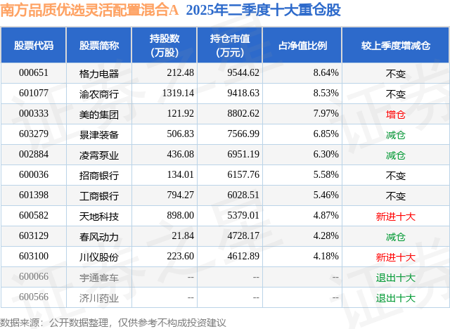 根据2025基金半年报公募基金重仓股数据,重仓该股的公募基金共7家,其中持有数量最多的公募基金为南方基金的南方品质优选灵活配置混合A。南方品质优选灵活配置混合A目前规模为10.87亿元,最新净值2.1209(7月21日),较上一交易日上涨0.6%,近一年上涨11.45%。该公募基金现任基金经理为袁立。袁立在任的基金产品包括:南方优享分红混合A,管理时间为2021年8月6日至今,期间收益率为1.61%;南方产业活力,管理时间为2024年1月12日至今,期间收益率为23.17%;南方瑞享混合A,管理时间为2025年6月24日至今,期间收益率为0.48%。
