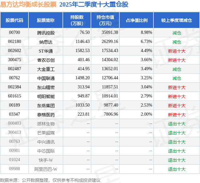 根据2025基金半年报公募基金重仓股数据,重仓该股的公募基金共97家,其中持有数量最多的公募基金为易方达基金的易方达均衡成长股票。易方达均衡成长股票目前规模为39.07亿元,最新净值1.0679(7月21日),较上一交易日上涨0.89%,近一年上涨20.39%。该公募基金现任基金经理为陈皓。陈皓在任的基金产品包括:易方达平稳增长混合,管理时间为2012年9月28日至今,期间收益率为341.75%;易方达科翔混合,管理时间为2014年5月10日至今,期间收益率为442.14%;易方达新经济混合,管理时间为2015年2月12日至今,期间收益率为265.3%;