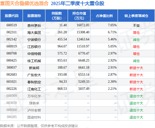 根据2025基金半年报公募基金重仓股数据,重仓该股的公募基金共2家,其中持有数量最多的公募基金为富国基金的富国天合稳健优选混合。富国天合稳健优选混合目前规模为22.81亿元,最新净值1.4961(7月21日),较上一交易日上涨1.2%,近一年上涨11.72%。该公募基金现任基金经理为张啸伟。张啸伟在任的基金产品包括:富国美丽中国混合A,管理时间为2016年5月19日至今,期间收益率为139.5%;富国睿泽回报混合,管理时间为2019年6月5日至今,期间收益率为101.22%。