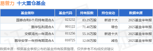 根据2025基金半年报公募基金重仓股数据,重仓该股的公募基金共4家,其中持有数量最多的公募基金为国泰基金的国泰合利6个月持有混合A。国泰合利6个月持有混合A目前规模为4.11亿元,最新净值1.024(7月21日),较上一交易日上涨0.16%。该公募基金现任基金经理为程瑶。程瑶在任的基金产品包括:国泰聚利价值定开混合,管理时间为2021年7月9日至今,期间收益率为10.67%;国泰鑫利一年持有期混合A,管理时间为2021年7月9日至今,期间收益率为11.42%;国泰通利9个月持有期混合A,管理时间为2021年7月9日至今,期间收益率为12.01%;国泰民安增利债券A,管理时间为2022年12月30日至今,期间收益率为10.13%。