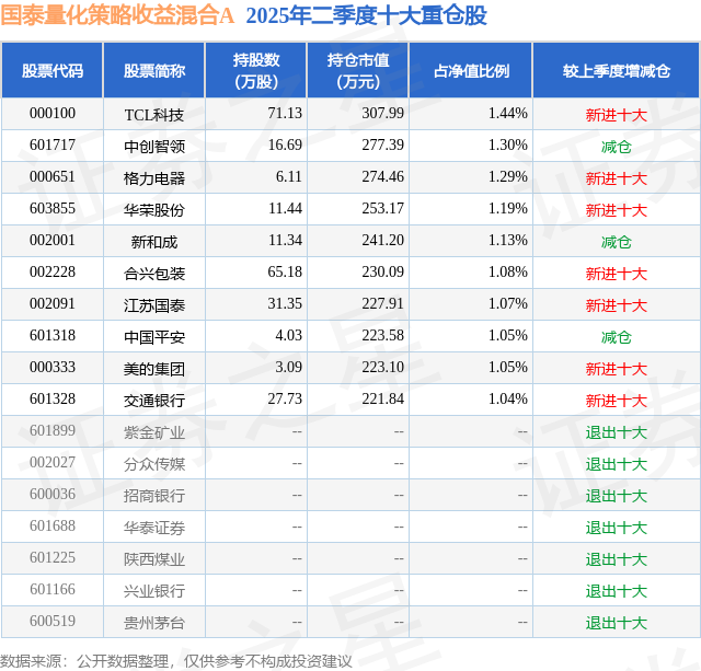 国泰量化策略收益混合A的前十大重仓股如下:
