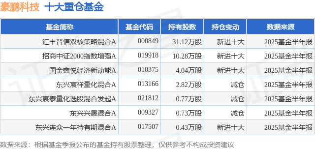 根据2025基金半年报公募基金重仓股数据,重仓该股的公募基金共7家,其中持有数量最多的公募基金为汇丰晋信基金的汇丰晋信双核策略混合A。汇丰晋信双核策略混合A目前规模为2.39亿元,最新净值1.4116(7月21日),较上一交易日上涨1.71%,近一年上涨31.95%。该公募基金现任基金经理为韦钰 刘禹良。刘禹良在任的基金产品包括:汇丰晋信大盘波动股票A,管理时间为2023年11月18日至今,期间收益率为3.67%;汇丰晋信中小盘低波动策略股票A,管理时间为2023年11月18日至今,期间收益率为-6.82%;汇丰晋信恒生龙头指数A,管理时间为2023年11月18日至今,期间收益率为21.26%;