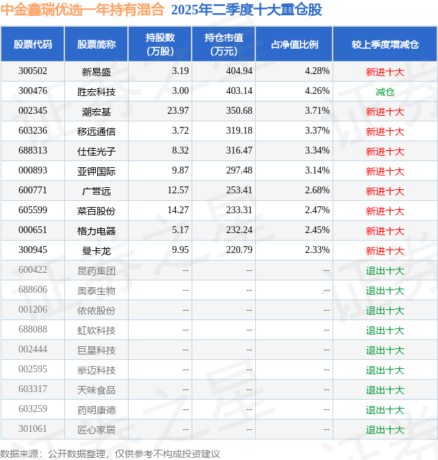 中金鑫瑞优选一年持有混合的前十大重仓股如下: