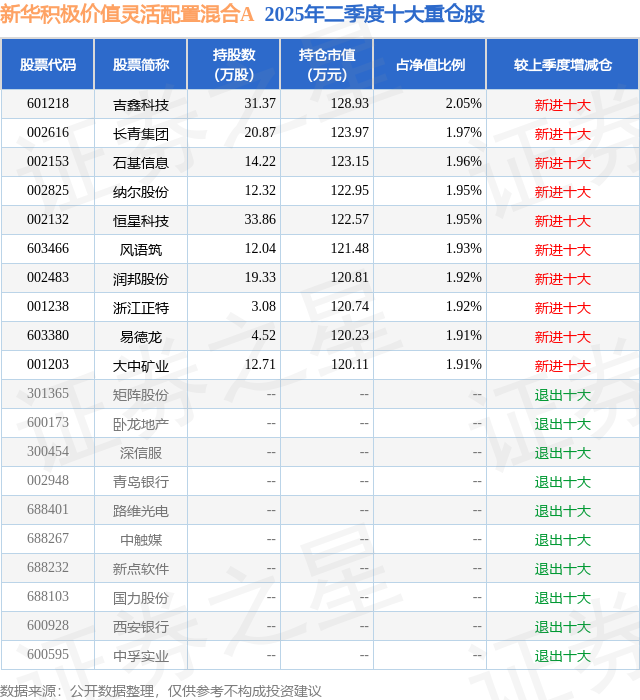 新华积极价值灵活配置混合A的前十大重仓股如下: