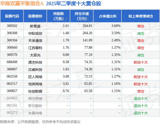 华商双翼平衡混合A的前十大重仓股如下: