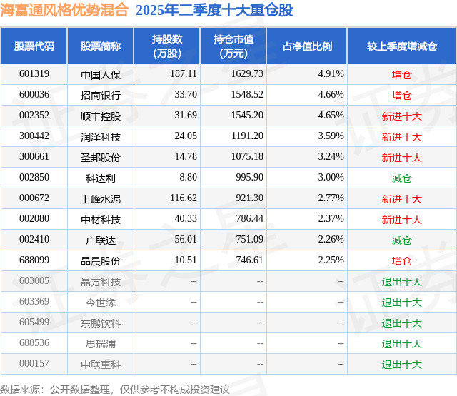 根据2025基金半年报公募基金重仓股数据,重仓该股的公募基金共3家,其中持有数量最多的公募基金为海富通基金的海富通风格优势混合。海富通风格优势混合目前规模为3.32亿元,最新净值0.9613(7月22日),较上一交易日上涨0.6%,近一年上涨23.01%。该公募基金现任基金经理为陆怡雯。