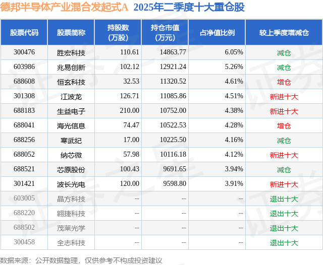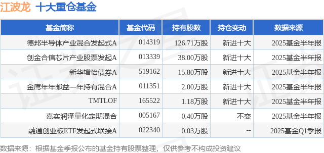 根据2025基金半年报公募基金重仓股数据,重仓该股的公募基金共6家,其中持有数量最多的公募基金为德邦基金的德邦半导体产业混合发起式A。德邦半导体产业混合发起式A目前规模为3.58亿元,最新净值1.2266(7月23日),较上一交易日上涨0.71%,近一年上涨38.76%。该公募基金现任基金经理为雷涛。雷涛在任的基金产品包括:德邦稳盈增长灵活配置混合A,管理时间为2023年3月29日至今,期间收益率为-22.01%;德邦福鑫灵活配置混合A,管理时间为2023年10月13日至今,期间收益率为-15.78%;德邦科技创新一年定开混合A,管理时间为2023年10月13日至今,期间收益率为-14.98%。