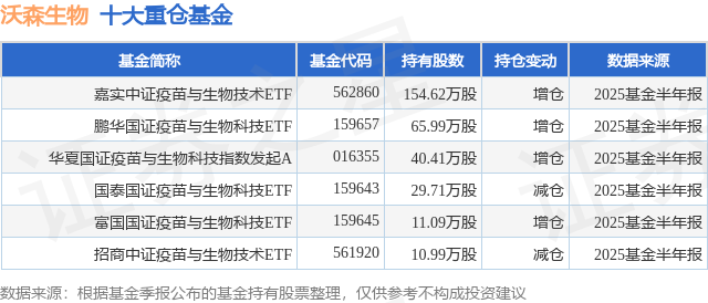 根据2025基金半年报公募基金重仓股数据,重仓该股的公募基金共6家,其中持有数量最多的公募基金为嘉实基金的嘉实中证疫苗与生物技术ETF。嘉实中证疫苗与生物技术ETF目前规模为2.5亿元,最新净值0.7182(7月23日),较上一交易日下跌0.57%,近一年上涨28.09%。该公募基金现任基金经理为王紫菡。王紫菡在任的基金产品包括:嘉实沪深300红利低波动ETF联接A,管理时间为2021年9月9日至今,期间收益率为42.83%;嘉实恒生科技ETF(QDII),管理时间为2021年9月9日至今,期间收益率为-13.15%;嘉实沪深300红利低波动ETF,管理时间为2021年9月9日至今,期间收益率为47.18%;嘉实医药健康100ETF,管理时间为2021年9月9日至今,期间收益率为-30.62%。