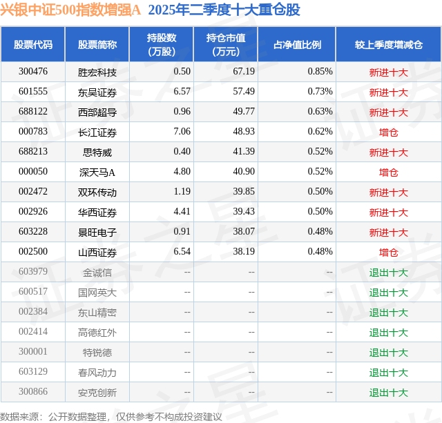 兴银中证500指数增强A的前十大重仓股如下: