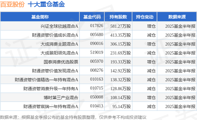 重仓百亚股份的前十大公募基金请见下表: