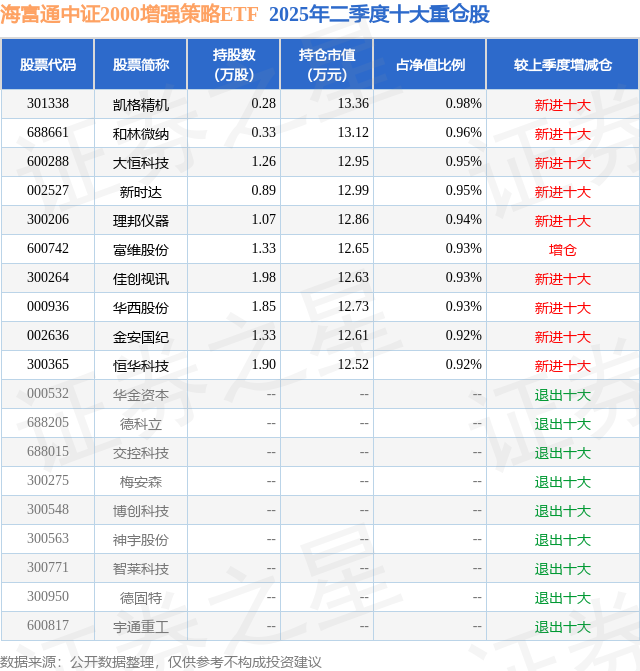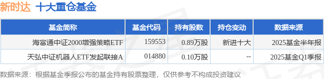 根据2025基金半年报公募基金重仓股数据,重仓该股的公募基金共1家,其中持有数量最多的公募基金为海富通基金的海富通中证2000增强策略ETF。海富通中证2000增强策略ETF目前规模为0.14亿元,最新净值1.5778(7月24日),较上一交易日上涨1.15%,近一年上涨82.91%。该公募基金现任基金经理为李自悟。李自悟在任的基金产品包括:海富通中证500增强A,管理时间为2023年2月15日至今,期间收益率为0.46%;海富通阿尔法对冲混合A,管理时间为2023年4月10日至今,期间收益率为-5.67%;海富通量化选股混合A,管理时间为2024年7月23日至今,期间收益率为19.24%。