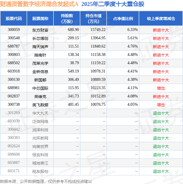 财通资管数字经济混合发起式A的前十大重仓股如下: