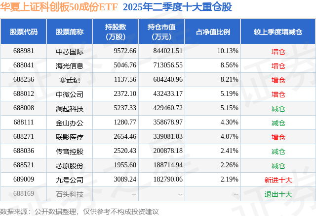 华夏上证科创板50成份ETF的前十大重仓股如下:
