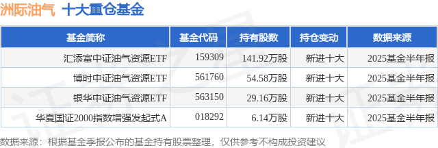 根据2025基金半年报公募基金重仓股数据,重仓该股的公募基金共4家,其中持有数量最多的公募基金为汇添富基金的汇添富中证油气资源ETF。汇添富中证油气资源ETF目前规模为1.21亿元,最新净值1.0111(7月24日),较上一交易日上涨0.77%,近一年上涨6.51%。该公募基金现任基金经理为晏阳。晏阳在任的基金产品包括:汇添富中证上海环交所碳中和ETF,管理时间为2022年7月13日至今,期间收益率为-20.41%;汇添富中证A100ETF,管理时间为2022年10月20日至今,期间收益率为18.21%;汇添富北证50成份指数A,管理时间为2022年12月27日至今,期间收益率为41.91%;汇添富中证上海环交所碳中和ETF发起式联接A,管理时间为2023年3月14日至今,期间收益率为-2.62%。