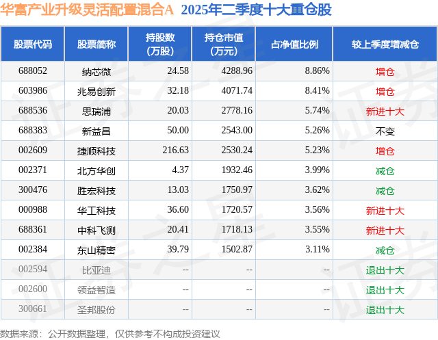 根据2025基金半年报公募基金重仓股数据,重仓该股的公募基金共7家,其中持有数量最多的公募基金为华富基金的华富产业升级灵活配置混合A。华富产业升级灵活配置混合A目前规模为4.81亿元,最新净值1.6964(7月24日),较上一交易日上涨1.04%,近一年上涨40.78%。该公募基金现任基金经理为陈奇。陈奇在任的基金产品包括:华富物联世界灵活配置混合A,管理时间为2019年10月21日至今,期间收益率为81.02%;华富国泰民安灵活配置混合A,管理时间为2021年3月19日至今,期间收益率为-3.99%;华富竞争力优选混合A,管理时间为2022年8月22日至今,期间收益率为-18.25%。