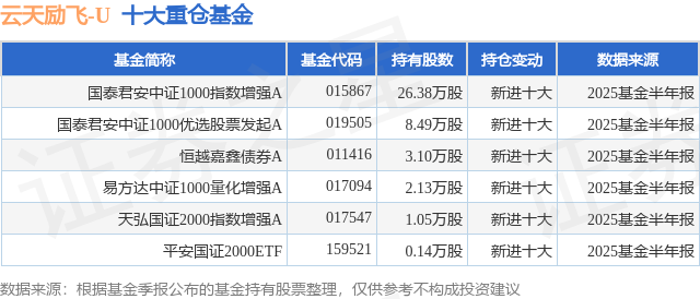根据2025基金半年报公募基金重仓股数据,重仓该股的公募基金共6家,其中持有数量最多的公募基金为国泰君安资管的国泰君安中证1000指数增强A。国泰君安中证1000指数增强A目前规模为7.86亿元,最新净值1.2919(7月24日),较上一交易日上涨1.27%,近一年上涨64.68%。该公募基金现任基金经理为胡崇海 刘晟。胡崇海在任的基金产品包括:国泰君安中证500指数增强A,管理时间为2021年12月15日至今,期间收益率为12.14%;国泰君安量化选股混合发起A,管理时间为2022年8月18日至今,期间收益率为29.79%;国泰君安科技创新精选三个月持有股票发起A,管理时间为2022年11月16日至今,期间收益率为23.24%。