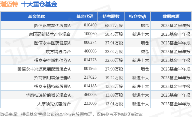 根据2025基金半年报公募基金重仓股数据,重仓该股的公募基金共18家,其中持有数量最多的公募基金为圆信永丰基金的圆信永丰聚优股票A。圆信永丰聚优股票A目前规模为7.19亿元,最新净值1.3059(8月7日),较上一交易日上涨0.42%,近一年上涨59.88%。该公募基金现任基金经理为肖世源。肖世源在任的基金产品包括:圆信永丰兴源灵活配置混合A,管理时间为2017年6月21日至今,期间收益率为130.94%;圆信永丰医药健康A,管理时间为2018年11月29日至今,期间收益率为130.01%;