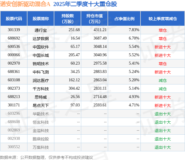 诺安创新驱动混合A的前十大重仓股如下: