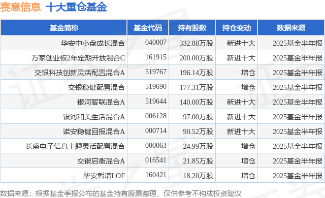 根据2025基金半年报公募基金重仓股数据,重仓该股的公募基金共15家,其中持有数量最多的公募基金为华安基金的华安中小盘成长混合。华安中小盘成长混合目前规模为18.5亿元,最新净值3.0942(8月7日),较上一交易日上涨0.25%,近一年上涨39.63%。该公募基金现任基金经理为金拓。金拓在任的基金产品包括:华安智增精选混合,管理时间为2023年10月23日至今,期间收益率为18.67%;华安景气回报混合发起式A,管理时间为2024年9月19日至今,期间收益率为20.72%;