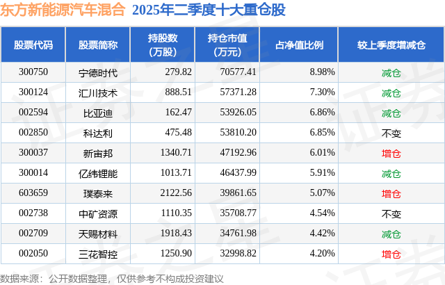 根据2025基金半年报公募基金重仓股数据,重仓该股的公募基金共34家,其中持有数量最多的公募基金为东方基金的东方新能源汽车混合。东方新能源汽车混合目前规模为78.58亿元,最新净值2.0905(8月7日),较上一交易日下跌0.21%,近一年上涨37.51%。该公募基金现任基金经理为李瑞。李瑞在任的基金产品包括:东方汽车产业趋势混合A,管理时间为2022年2月9日至今,期间收益率为-13.92%;东方高端制造混合A,管理时间为2023年3月1日至今,期间收益率为-20.46%;东方低碳经济混合A,管理时间为2025年3月4日至今,期间收益率为3.91%。