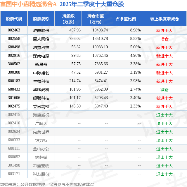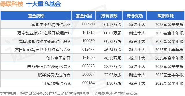 根据2025基金半年报公募基金重仓股数据,重仓该股的公募基金共8家,其中持有数量最多的公募基金为富国基金的富国中小盘精选混合A。富国中小盘精选混合A目前规模为17.29亿元,最新净值3.608(8月8日),较上一交易日上涨0.06%,近一年上涨62.52%。该公募基金现任基金经理为曹晋。曹晋在任的基金产品包括:富国通胀通缩主题轮动混合A,管理时间为2019年2月1日至今,期间收益率为230.65%;富国创业板两年定开混合,管理时间为2020年7月14日至今,期间收益率为36.52%;富国成长动力混合A,管理时间为2020年9月17日至今,期间收益率为2.23%。