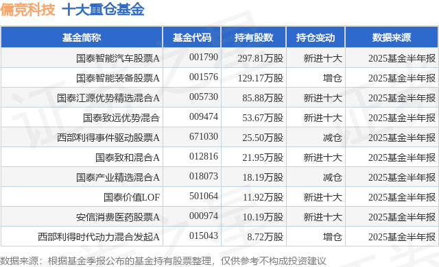 根据2025基金半年报公募基金重仓股数据,重仓该股的公募基金共13家,其中持有数量最多的公募基金为国泰基金的国泰智能汽车股票A。国泰智能汽车股票A目前规模为36.78亿元,最新净值1.9025(8月8日),较上一交易日下跌1.25%,近一年上涨34.93%。该公募基金现任基金经理为王阳。王阳在任的基金产品包括:国泰智能装备股票A,管理时间为2018年11月13日至今,期间收益率为129.79%;国泰价值精选灵活配置混合A,管理时间为2019年8月15日至今,期间收益率为57.9%;国泰价值先锋股票A,管理时间为2021年3月9日至今,期间收益率为5.15%。
