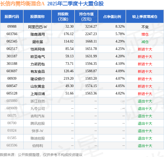 根据2025基金半年报公募基金重仓股数据,重仓该股的公募基金共8家,其中持有数量最多的公募基金为长信基金的长信内需均衡混合A。长信内需均衡混合A目前规模为3.58亿元,最新净值0.5867(8月8日),较上一交易日上涨0.12%,近一年上涨24.96%。该公募基金现任基金经理为王祺。