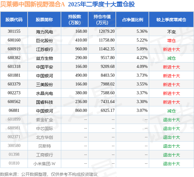 贝莱德中国新视野混合A的前十大重仓股如下: