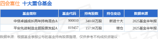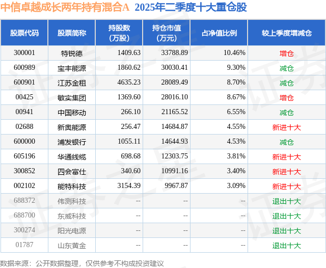 根据2025基金半年报公募基金重仓股数据,重仓该股的公募基金共2家,其中持有数量最多的公募基金为中信证券资产管理的中信卓越成长两年持有混合A。中信卓越成长两年持有混合A目前规模为10.05亿元,最新净值2.0866(8月8日),较上一交易日上涨0.23%,近一年上涨19.31%。该公募基金现任基金经理为魏来。