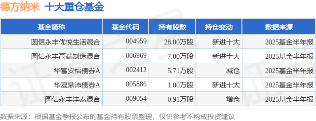 根据2025基金半年报公募基金重仓股数据,重仓该股的公募基金共5家,其中持有数量最多的公募基金为圆信永丰基金的圆信永丰优悦生活混合。圆信永丰优悦生活混合目前规模为3.26亿元,最新净值2.1141(8月8日),较上一交易日下跌0.38%,近一年上涨26.58%。该公募基金现任基金经理为党伟。党伟在任的基金产品包括:圆信永丰高端制造混合,管理时间为2021年9月27日至今,期间收益率为-23.07%;圆信永丰沣泰混合,管理时间为2021年9月27日至今,期间收益率为24.53%;